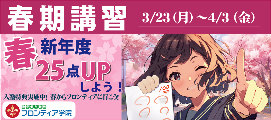 こんにちは!伊勢原教室の多田です。 共通テストも終わってついに高校入試まであと数週間となり、 実際に出願期間がスタートするなど、 入試が間近に迫ってきたという感覚をこれでもかと感じる時期となりました。 現在、フロンティア …